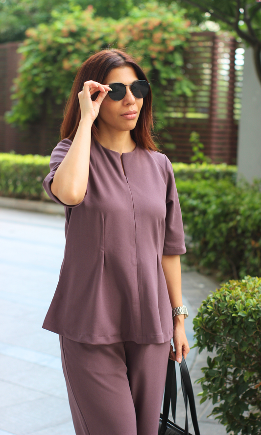 Viola Purple Sleeved Sleek-Pleat Detail and Flared Pants Co-ord