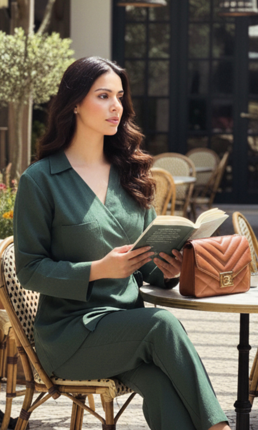 Bottle Green Linen Cuts Detail Kimono Top with Pants