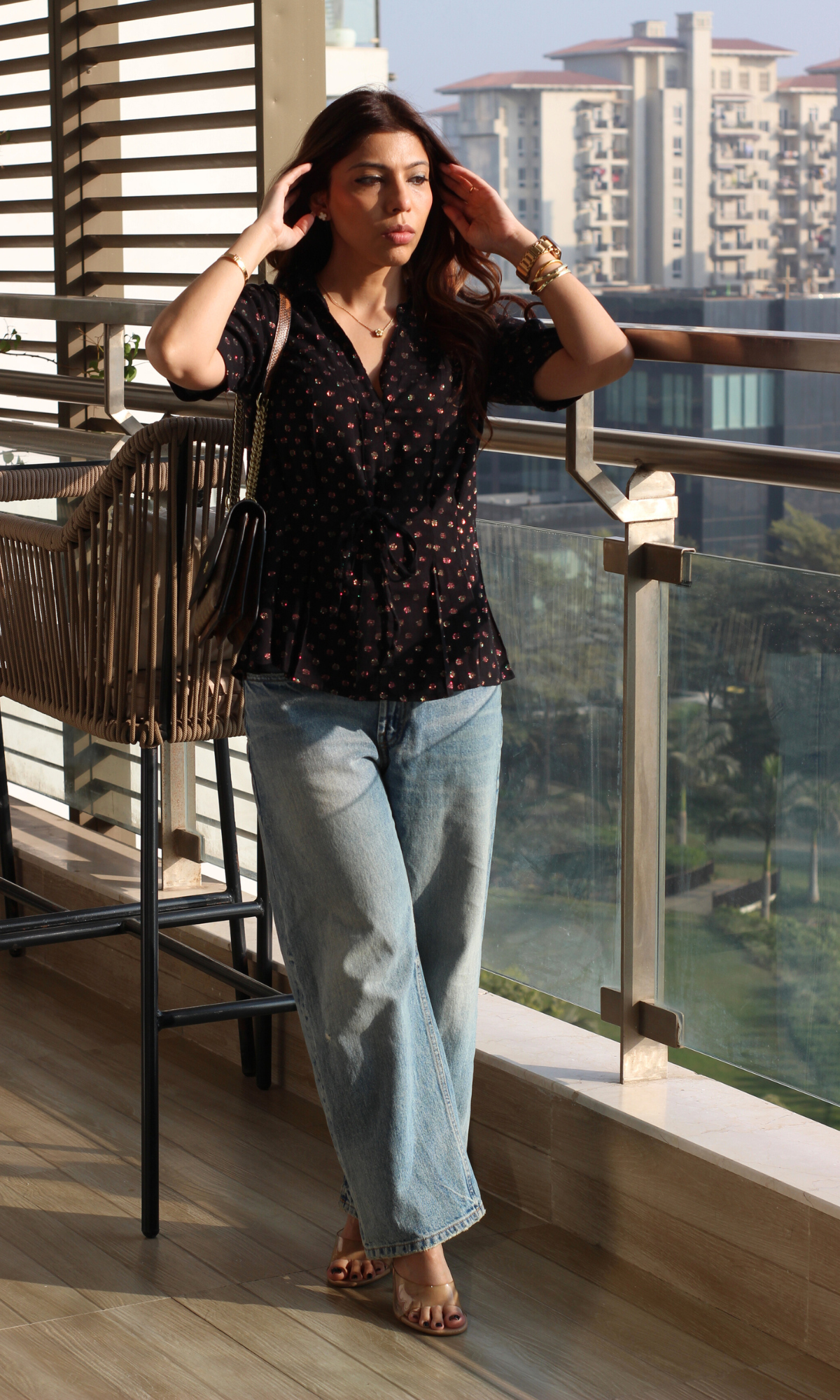 This top is your go-to for easy, effortless style. With its sharp collar, flattering V-neckline, and lurex, this top brings just the right amount of polish. The adjustable drawstring cinches the waist perfectly, giving you the option to wear it loose or fitted. Pair it with jeans or trousers for a cool, everyday look.