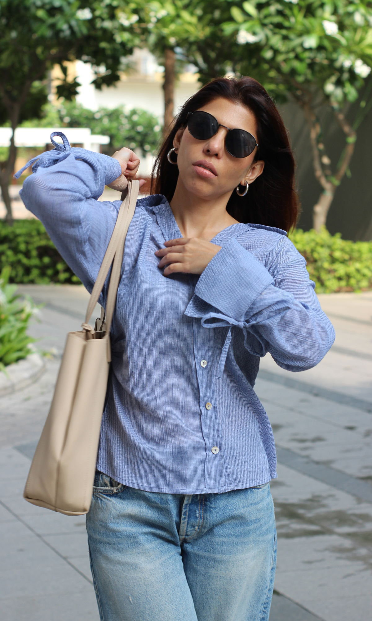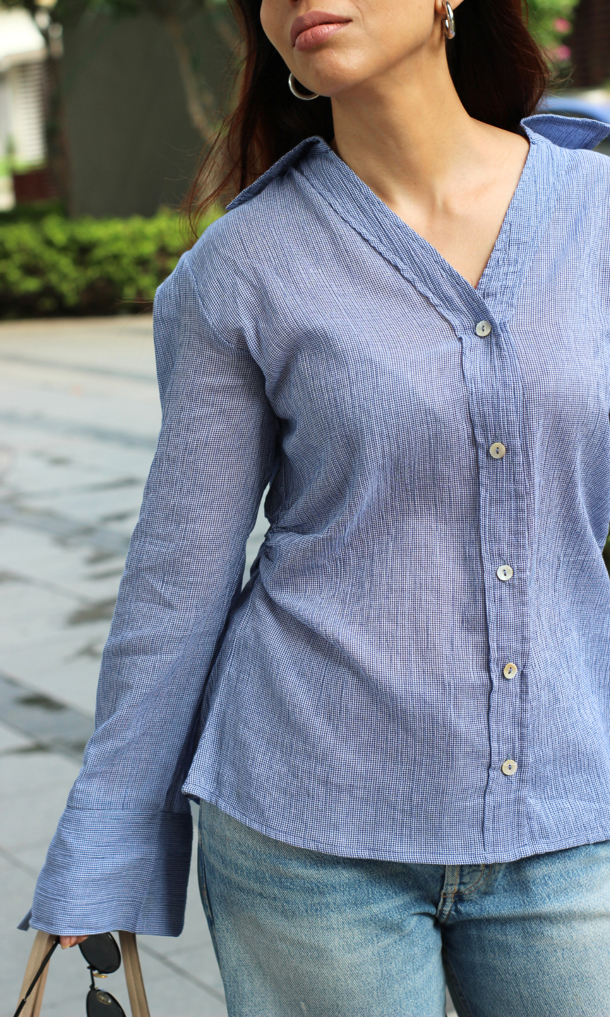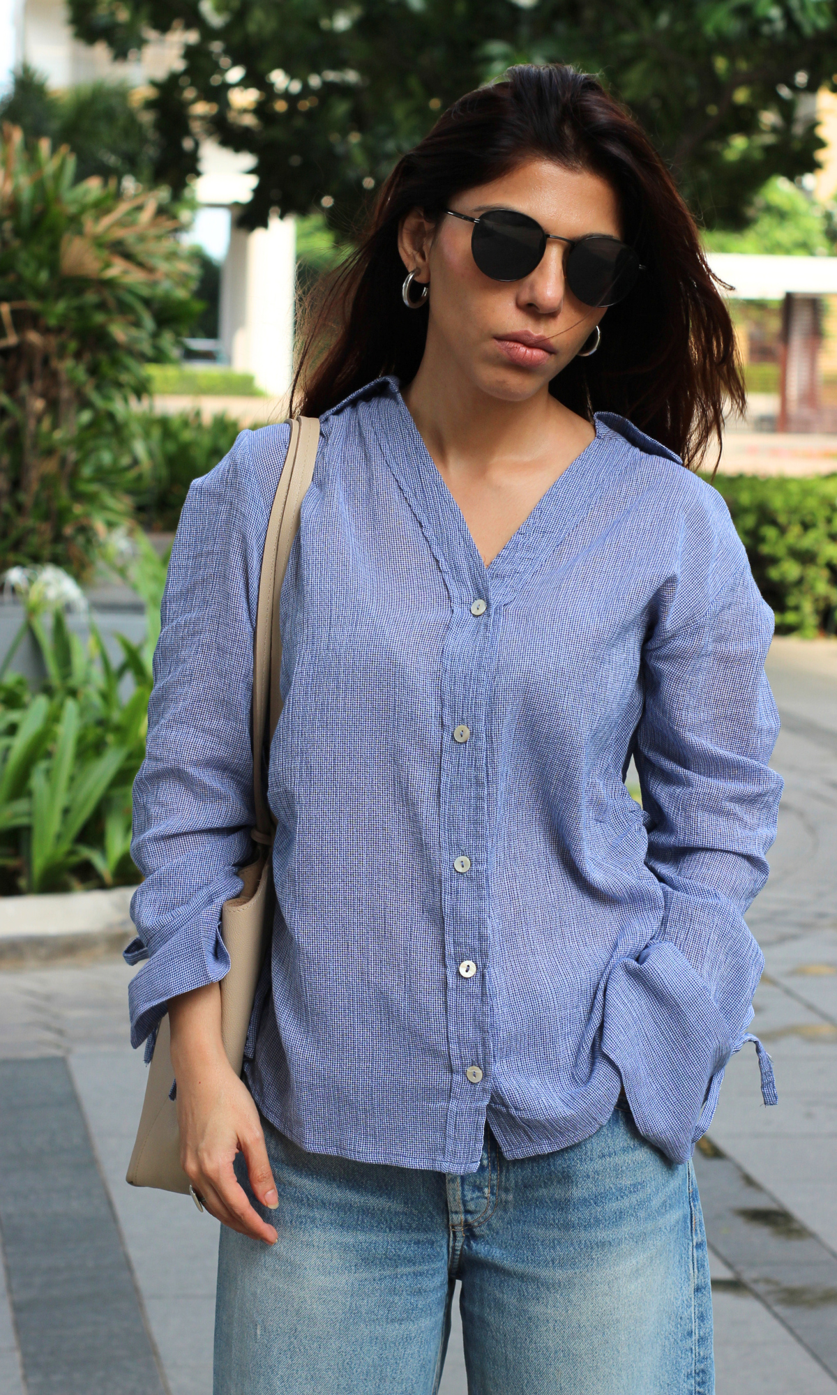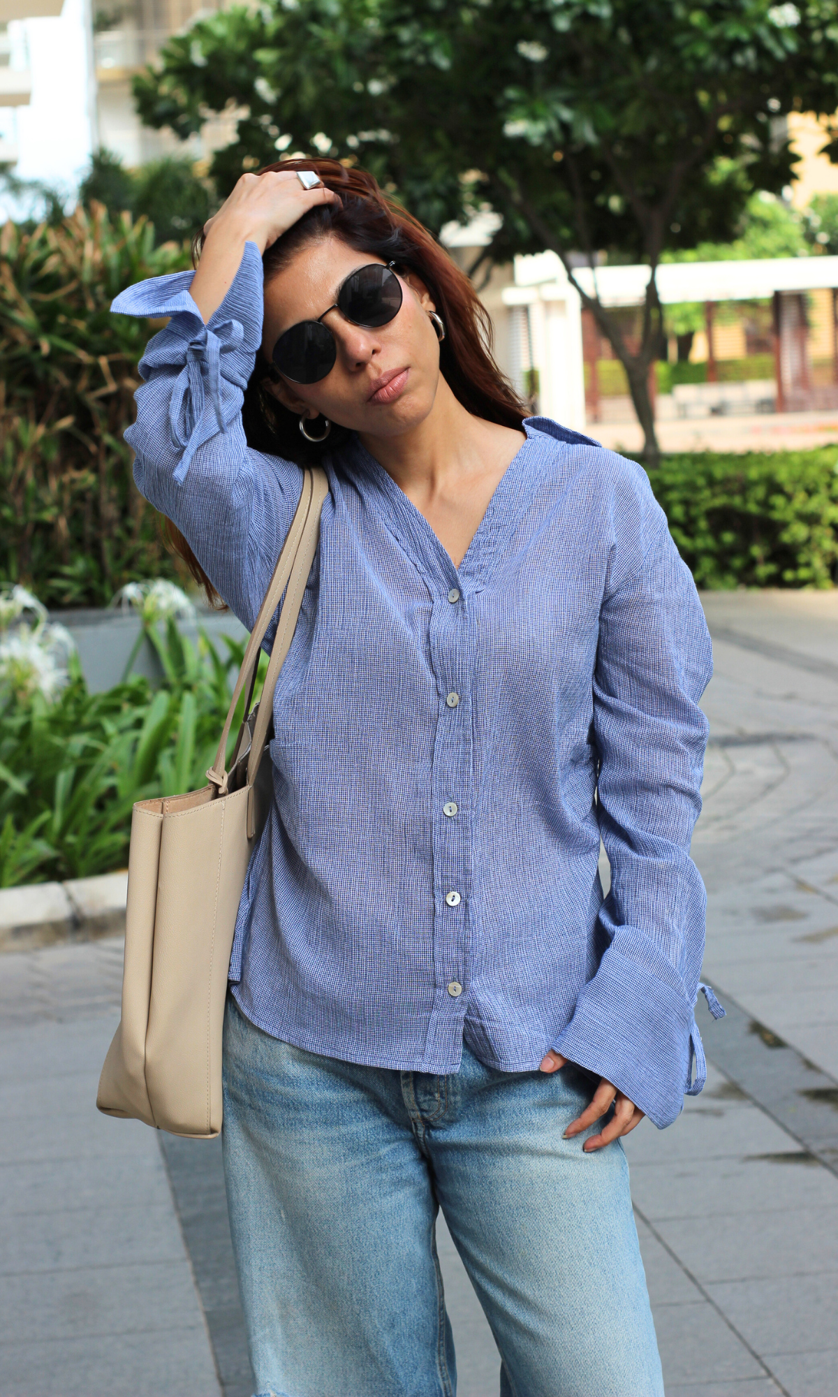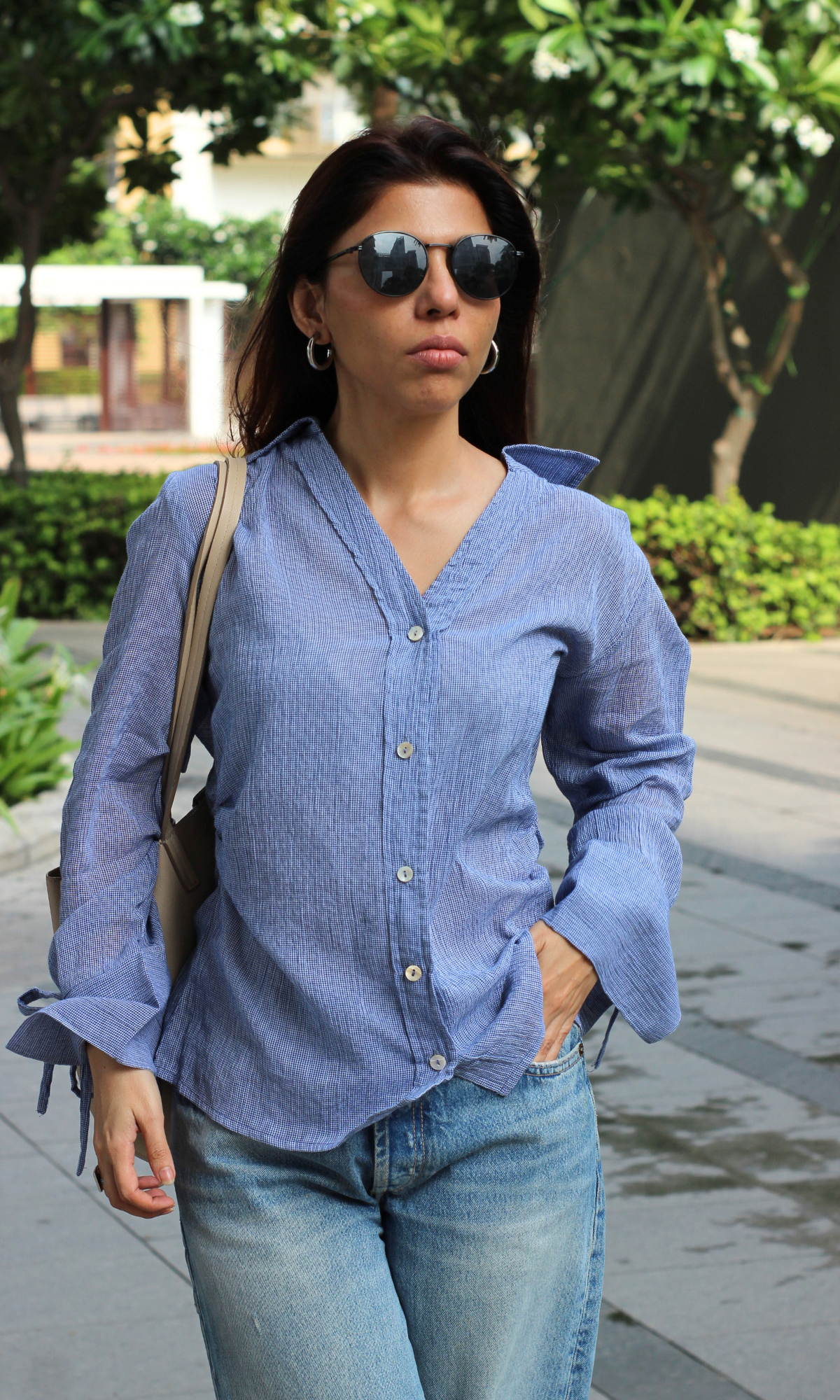 Soft, lived-in, and secretly chic — This shirt is made from a textured crinkled cotton that never clings and never needs ironing. It features a relaxed V-neckline, full sleeves with tie-cuff details, and an easy, slightly oversized fit that moves with you. The subtle grid texture adds dimension, while the Haze Blue hue keeps things cool and versatile. Tuck it in, half-tuck it, or wear it loose — it’s a wardrobe shapeshifter that pairs just as well with denims as with tailored bottoms.