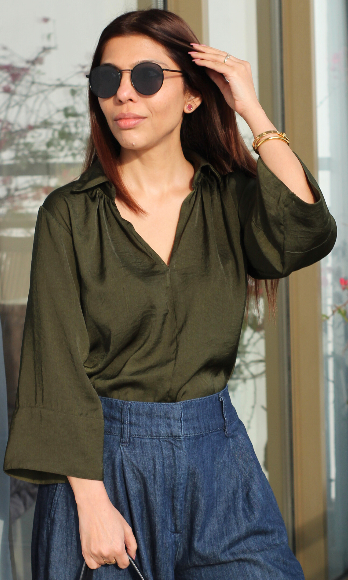 Blouse in an airy light satin featuring a small collar with gathers and a V-shaped neckline. 3/4th, voluminous flared sleeves