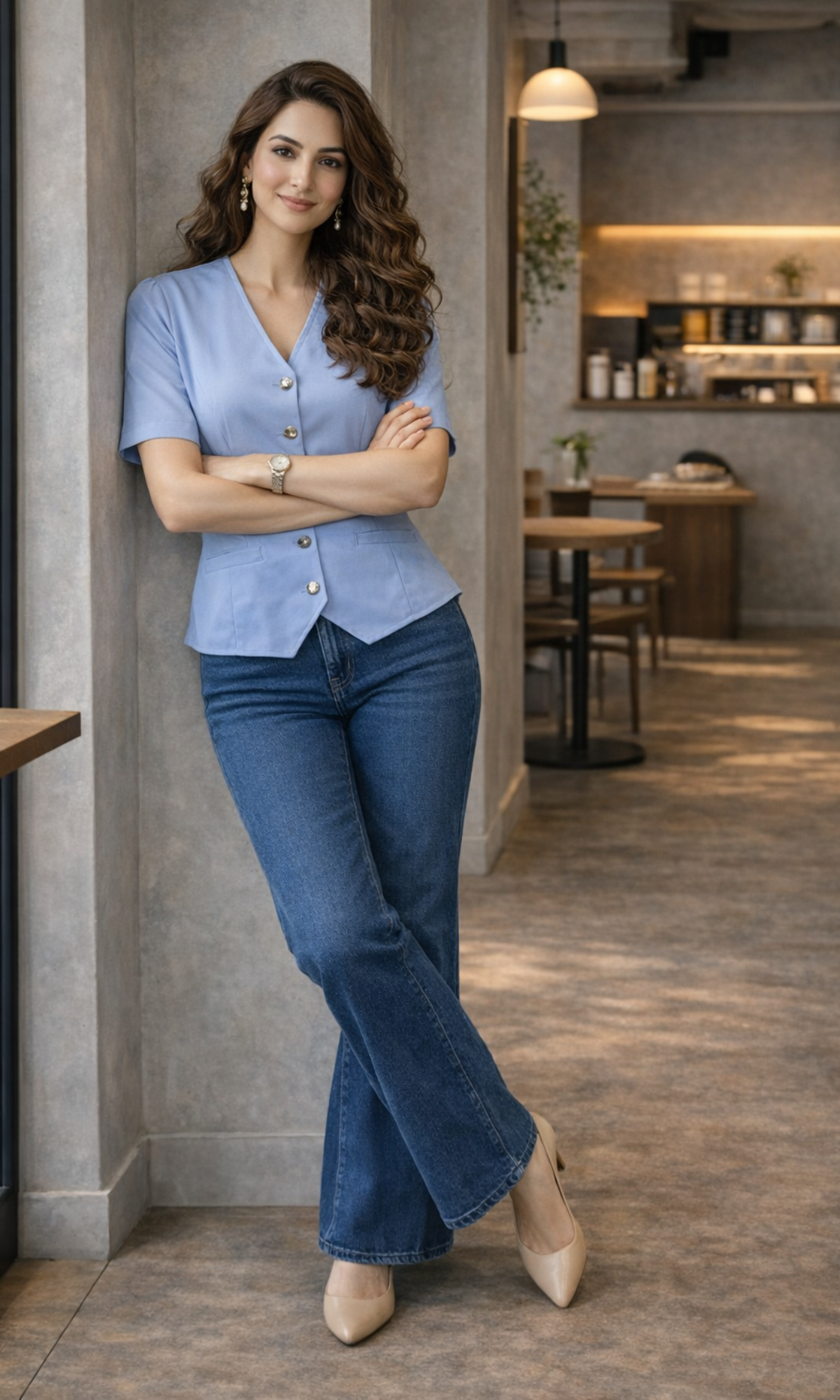 A refined essential with a sharp, modern finish. Crafted in a soft powder blue hue, this structured top features a flattering V-neckline and statement metallic buttons that add subtle polish.