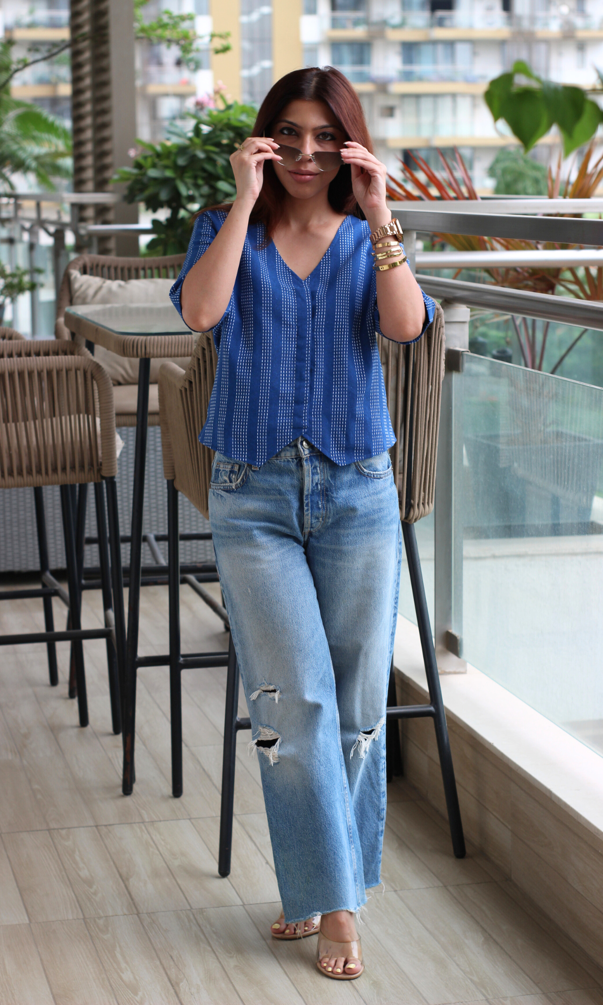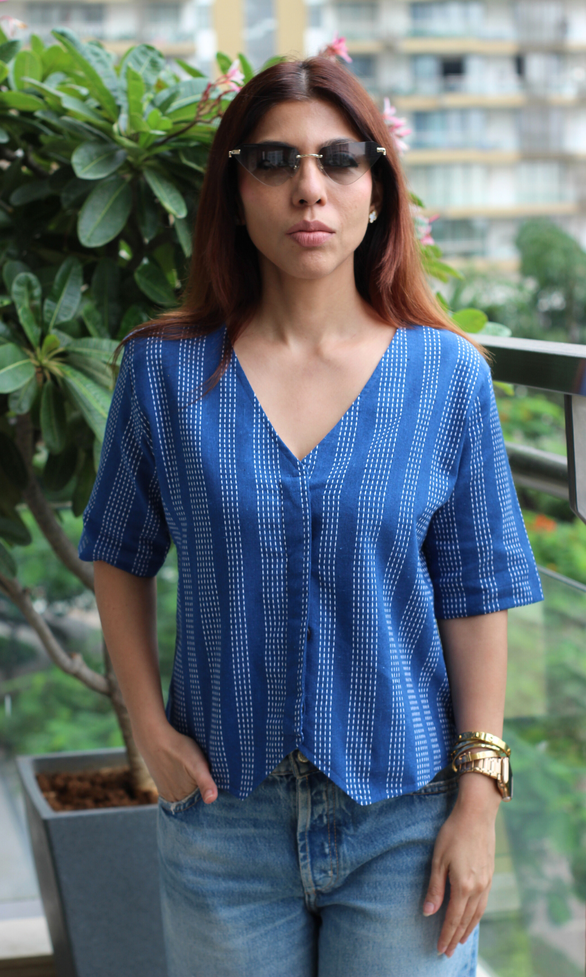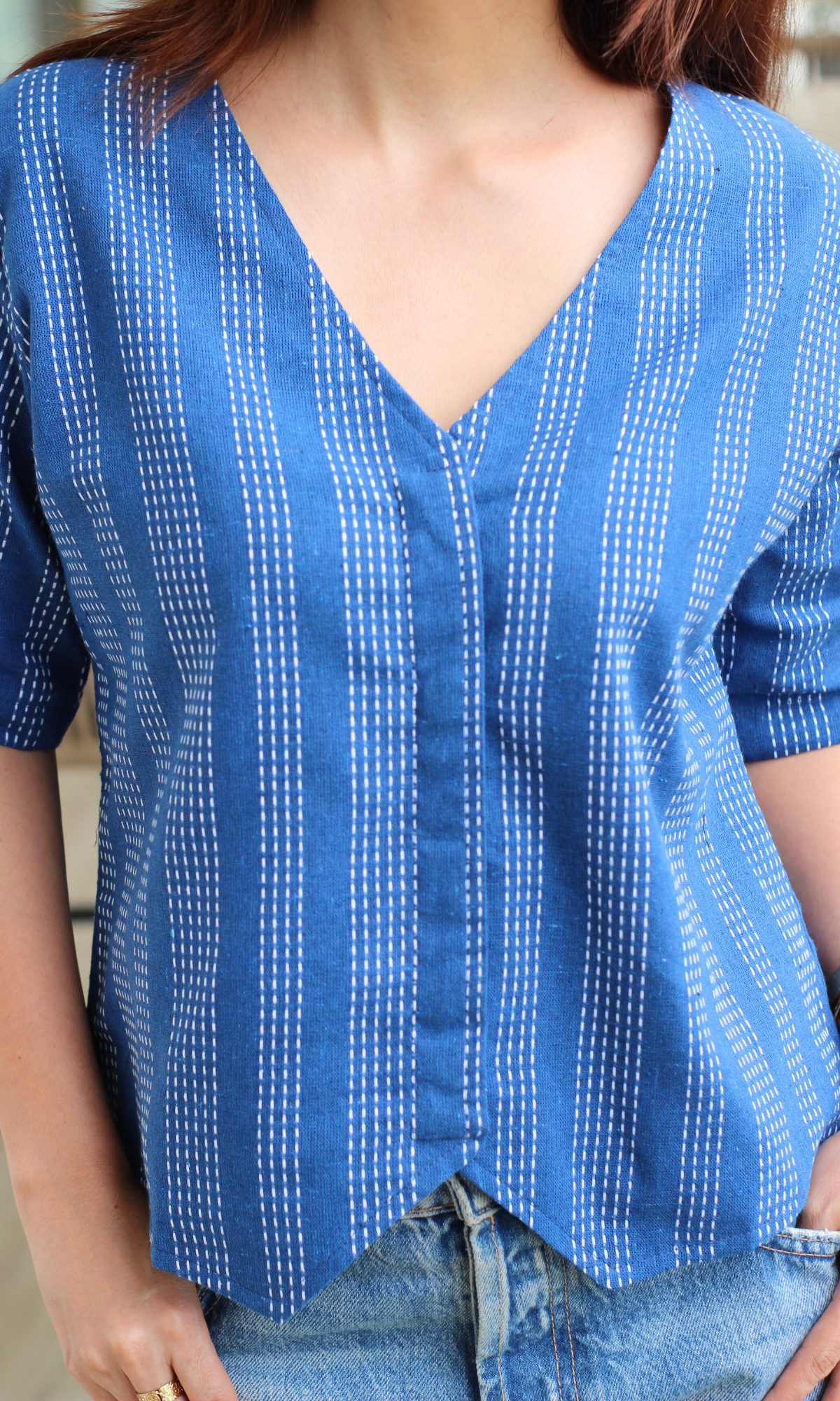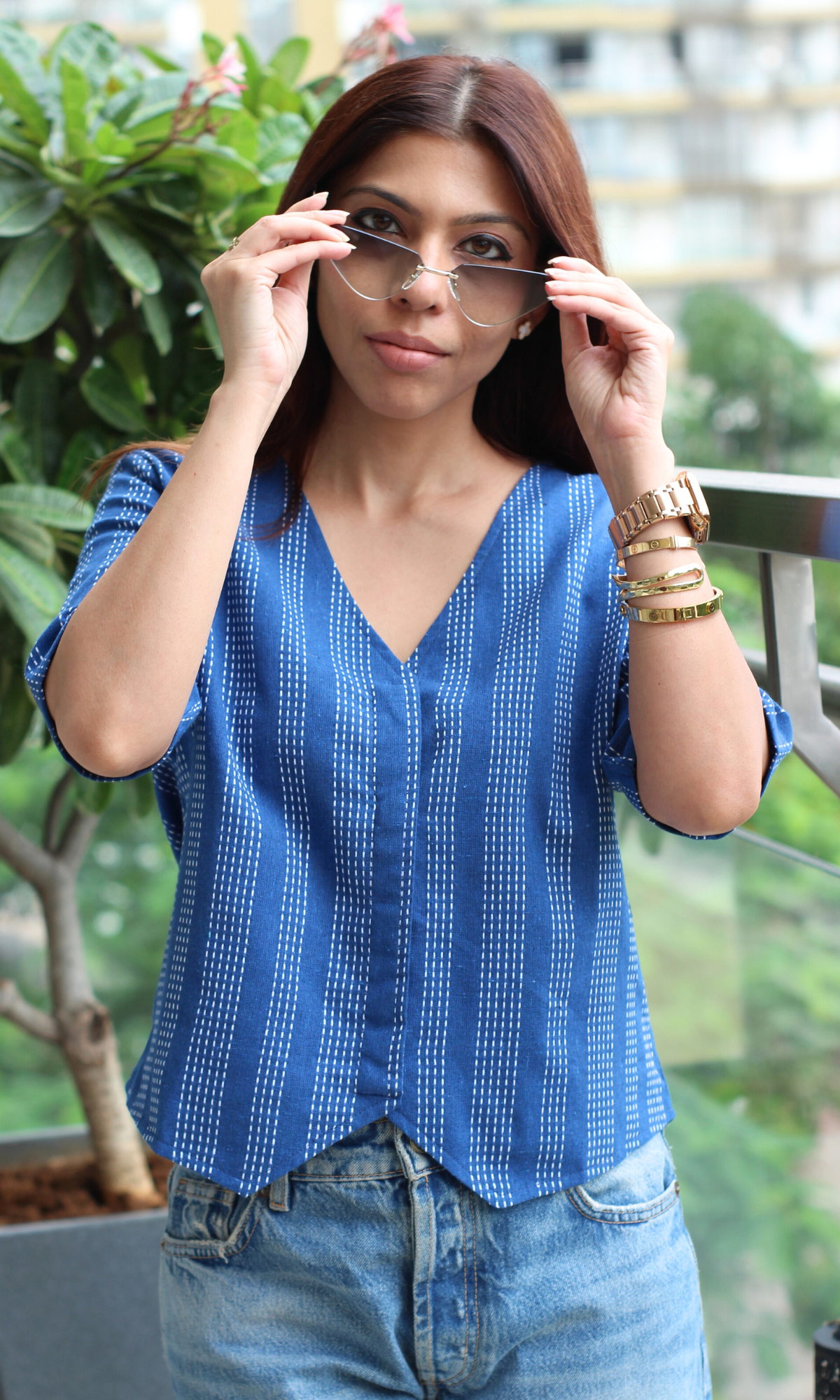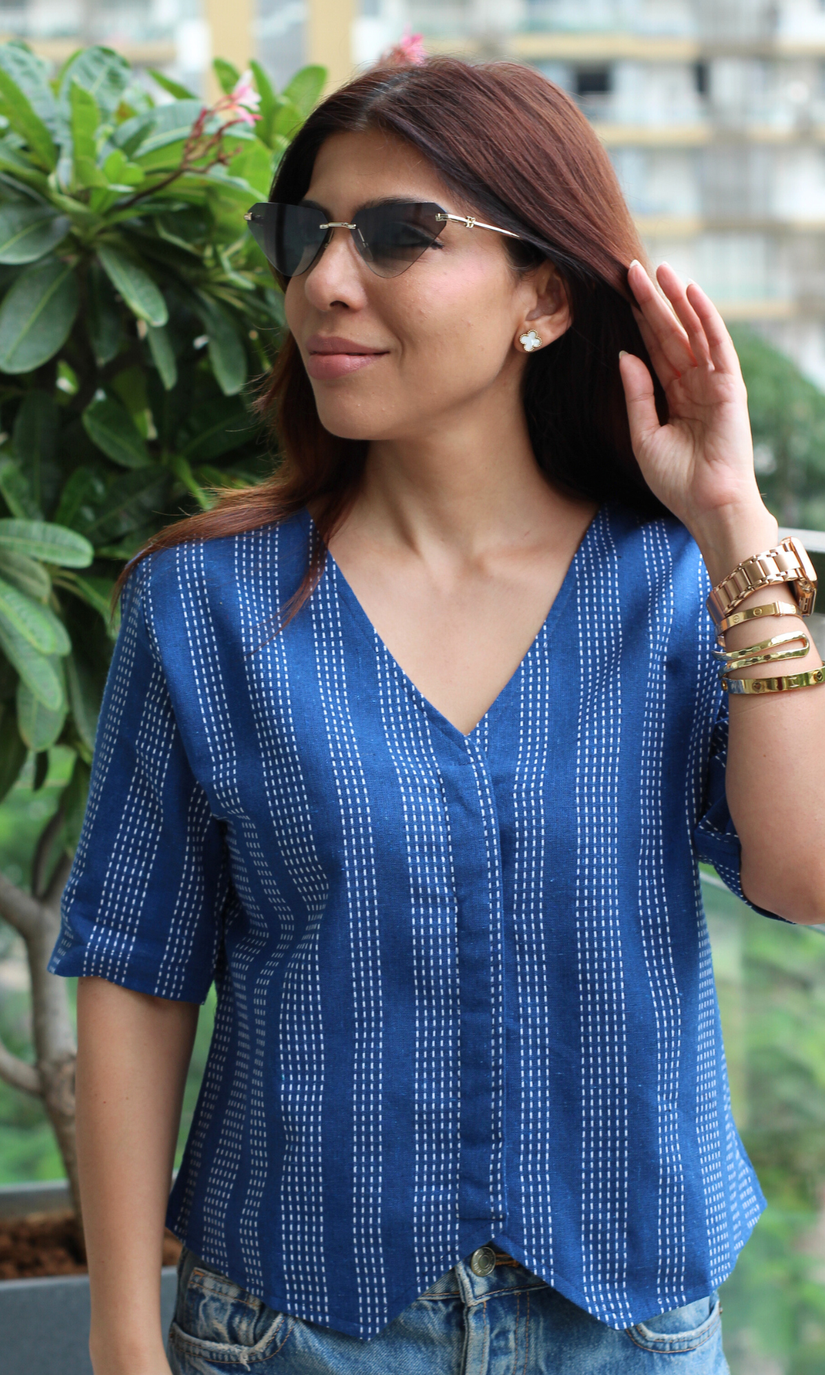 Cut from a lightweight, breathable fabric that feels soft against the skin, this V-neck top is all about comfort without compromising style. The vertical stripe pattern elongates the frame, while the relaxed fit and straight hem give it an easy, flowy drape. Designed with a clean neckline and subtle side slits for added movement, it’s perfect for all-day wear — from coffee runs to casual Fridays.