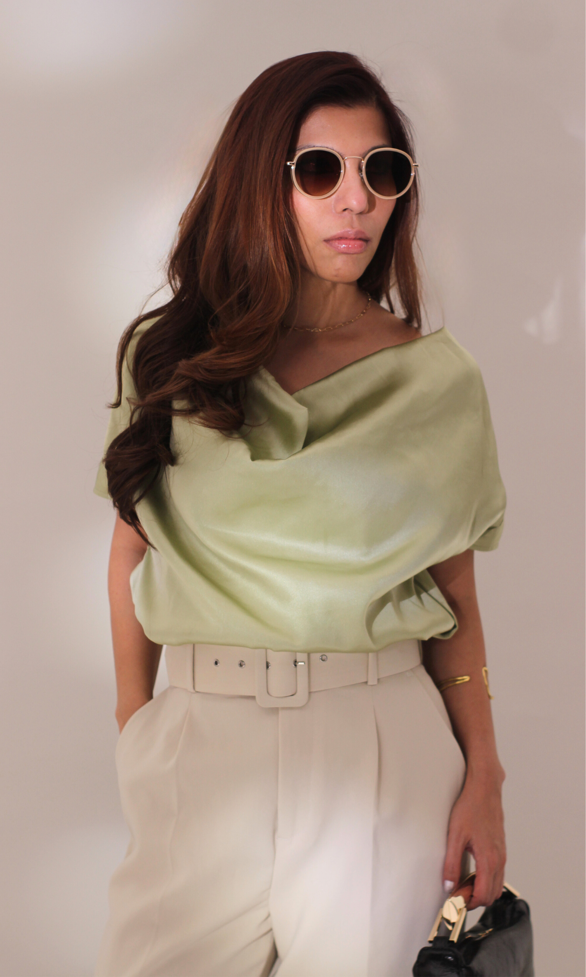 Cowl Neck top with gently draped effect in softly draping satin with short sleeves that have folded ends.