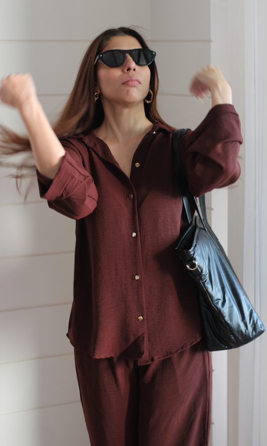 Chocolate Metallic Buttoned Shirt and Pants Co-ord