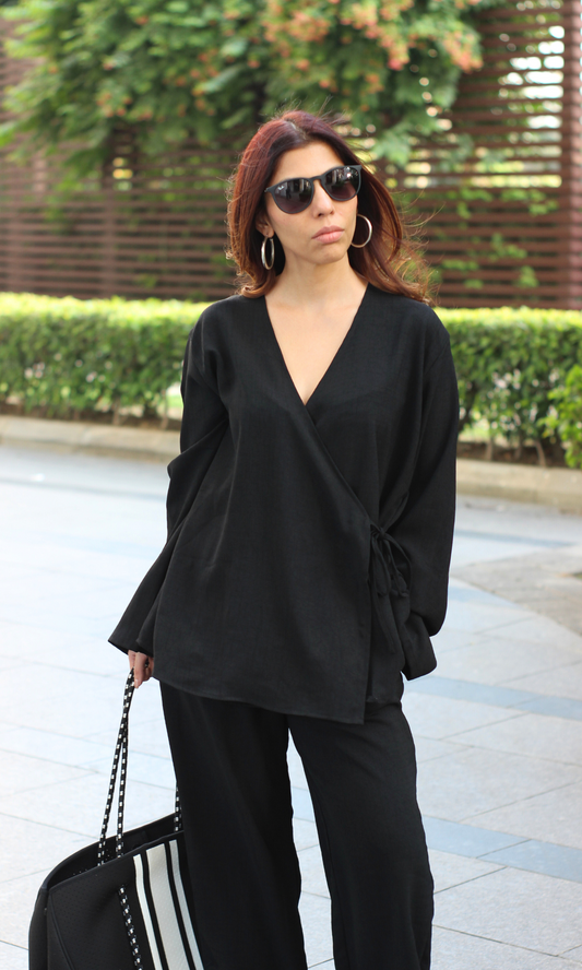 Black Textured Tie Detail Kimono Top with Pants Co-ord