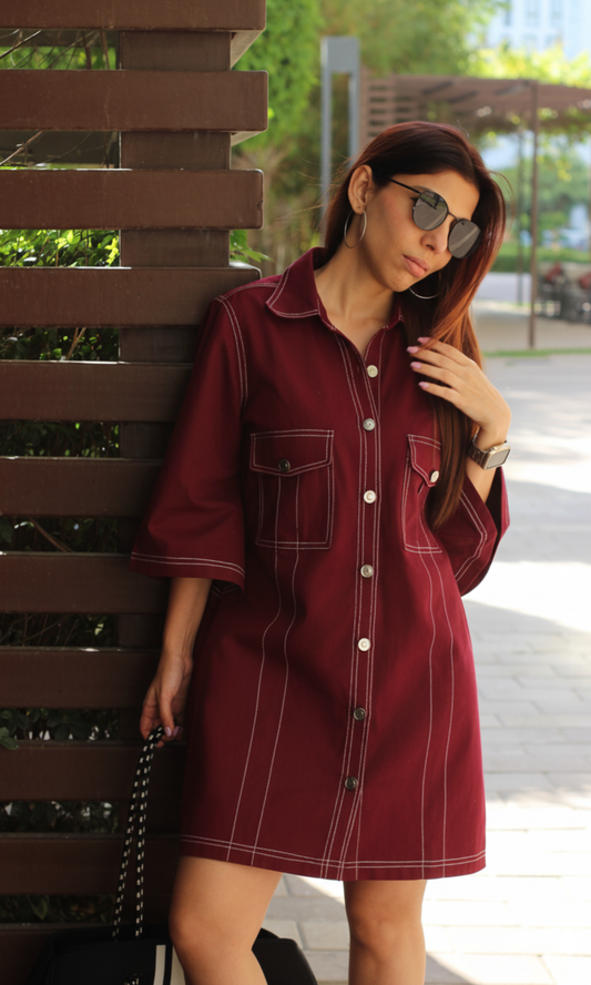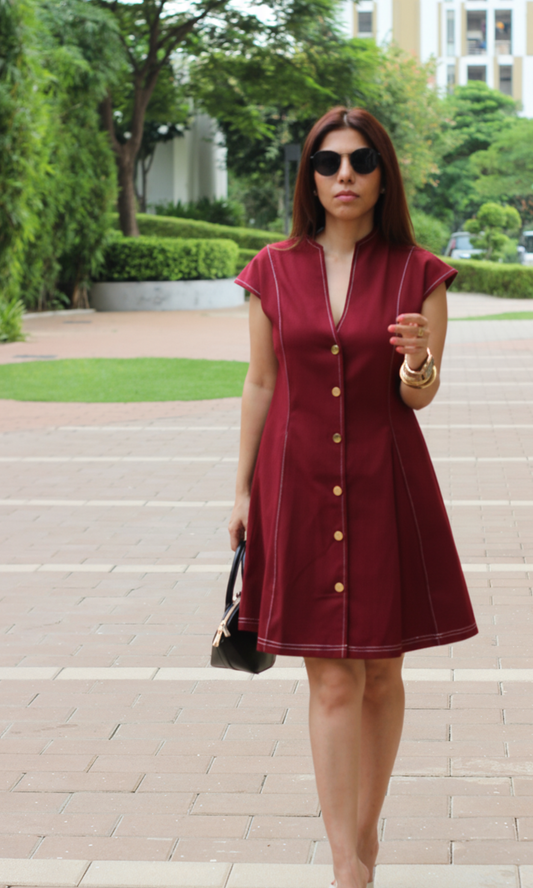 Merlot Thread Detail Metallic Buttoned Dress